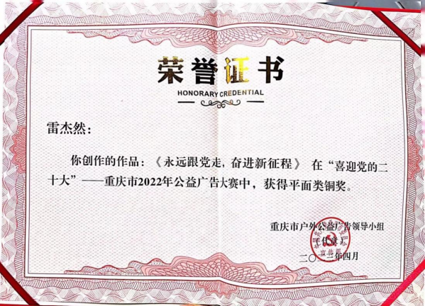 4月14日,喜迎党的二十大”——重庆市2022年公益广告大赛成功闭幕2022级艺术设计硕士雷杰然同学创作的作品《永远跟党走,奋进新征程》荣获平面类铜奖。作品主题党的二十大以来重庆取得的发展成就为创意点,分别从精神需弘扬、城乡齐发展、全民奔小康三个方面对重庆红岩精神以及重庆民生问题等内容进行创意表现,以此体现出我市在经济社会发展、人民生活改善、精神文明建设等方面取得巨大成就,为奋力书写重庆全面建设社会主义现代化新篇章凝聚正能量、营造好氛围。
