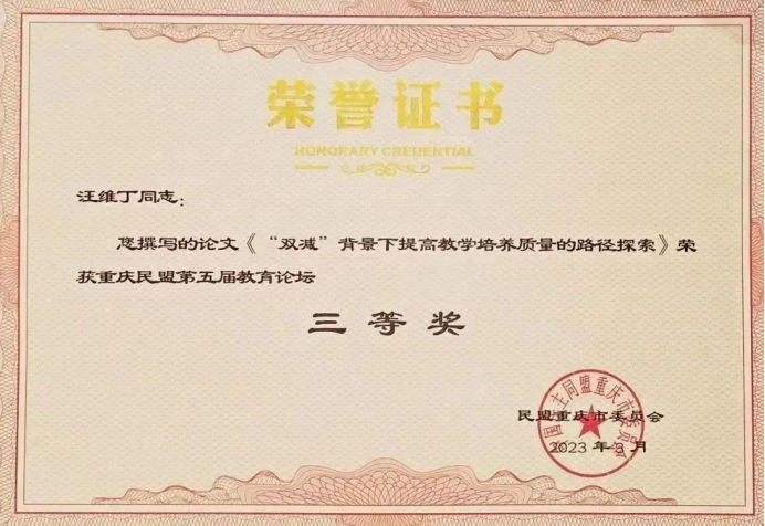 2022年10月,民盟重庆市委会启动了重庆民盟第五届教育论坛论文征集活动,公司副经理汪维丁教授深入调查研究,围绕主题认真撰写调研报告,经过专家评审,汪维丁教授提交的论文《“双减”背景下提高教学培养质量的路径探索》荣获重庆民盟第五届教育论坛三等奖。
