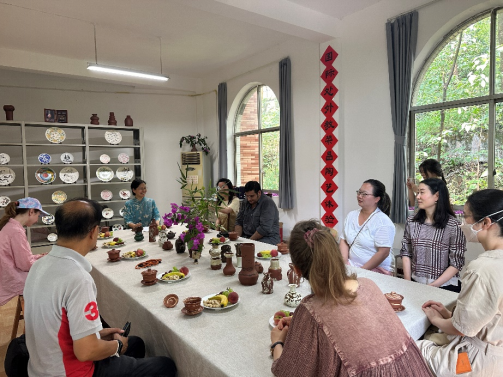 回到办公区,大家用着荣昌陶胶泥盖碗,且赏且饮,围绕“陶瓷”这一话题展开了交流。泰国教师Mr.Somsak讲了泰国的陶瓷,说“在泰国,有很多瓷器底部都印有Made in china字样,都是从中国运来的。”大家不停地拿起桌上的精美陶器欣赏并提出问题,如未来荣昌陶的发展方向如何?从材质、技法、釉色等方面怎样体现创新等。整整三个小时的活动,大家仍意犹未尽。最后,何田田对活动进行了总结。在场的外教纷纷表示,这是一次很有趣且很有收获的活动,并期待着下一次.......